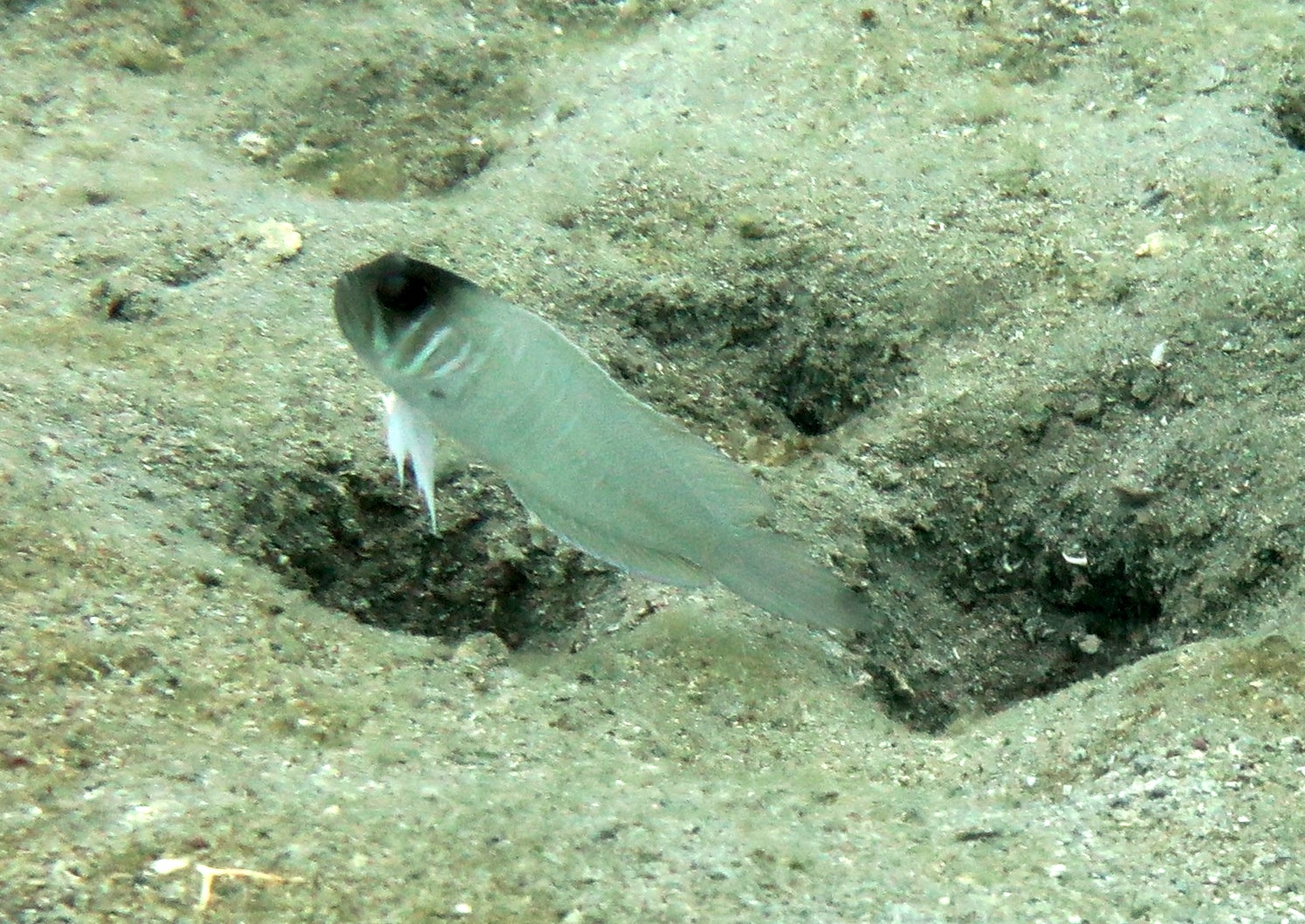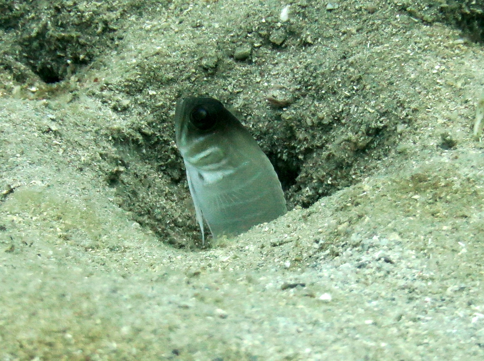 I saw this jawfish on the sandy area immediately below the buoy in Cabomex, Anegada de Adentro, at about 14m depth. I knew it was not any of the jawfishes I had reported before: face markings, behavior, and burrow type gave it away as a different species. I was set on identifying it more than on making any impression on the competition jury, so I spent my allotted 90 minutes by the jawfish, as motionless as possible, and trying to make it get used to the camera just 15cm away from its burrow. The series of photographs allowed me to identify it as a Swordtail Jawfish (Lonchopisthus micrognathus) based on the body bars and the pointy protruding tail, as described in the sketches of the ReefNet Fish Identification DVD. In looking at the REEF database later, I realized it is extremely uncommon to see this species. So all in all, I felt I had won a big prize in that competition!"