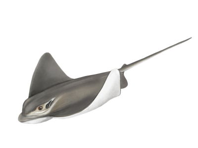 Bat Rays are found throughout the waters of California, as well as north to Oregon and south to the Baja peninsula in Mexico. Female Bat Rays can reach a maximum length of 6 ft across, while males are much smaller, reaching a maximum size of 3 ft. They can be found living in a variety of habitats, including sand and mud flats and kelp beds.