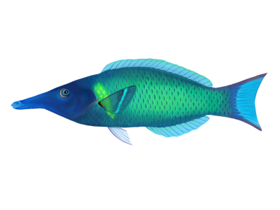 Known for their slender body and greatly elongated snout that looks like a bird beak, the Pacific Bird Wrasse can be found in the CIP, SOP, and HAW survey regions. The terminal phase males are dark green in coloration with a blue/ green head and bright mark behind the pectoral fin, while the initial phase has many different colors but always has the long, curved snout.