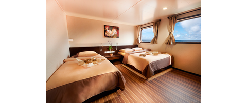 Accommodations: The Blue Manta Explorer sleeps up to 22 passengers. Staterooms on the upper, main, and lower deck will be assigned based on the availabilty of bedding setups for each reservation. All staterooms have a window, air-conditioning and a private ensuite bathroom.