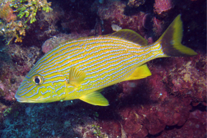Blue stripes over yellow-gold. Dark tail and dorsal fins have light margins; other fins yellow.